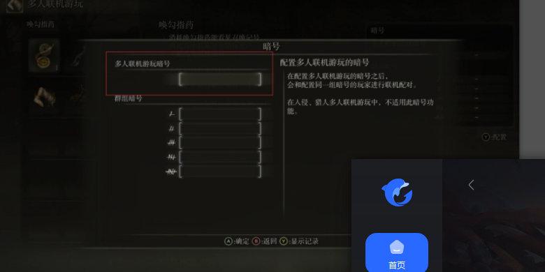 注意:这个时候如果使用手柄按下【Y键】,如果使用键盘按下【F键】,相对一般的联机方式多了一个步骤,需要设定艾尔登法环联机暗号。