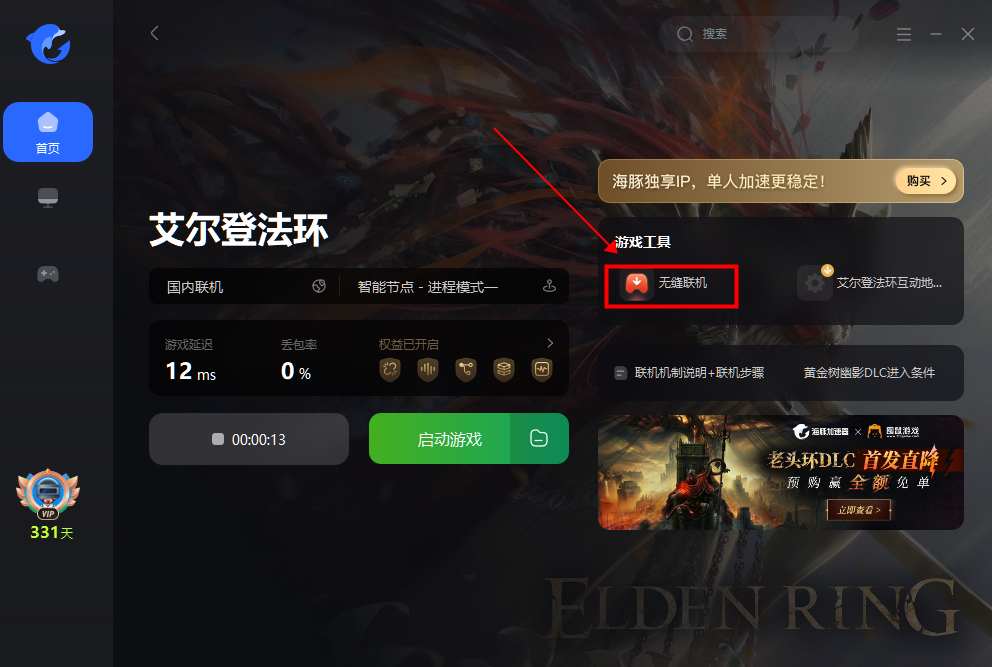 1. 打开海豚加速器,搜索【艾尔登法环】,建议选择港服开启加速;
