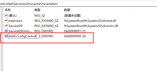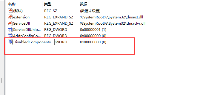 创建名为“AddrConfigControl”的DWORD(32位)值和“DisabledComponents ”的DWORD(32位)值