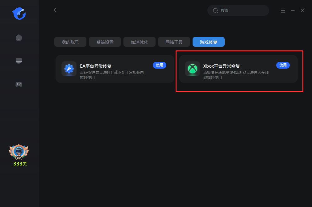 1、请打开海豚加速器-工具箱,找到 xboxlive平台异常修复。