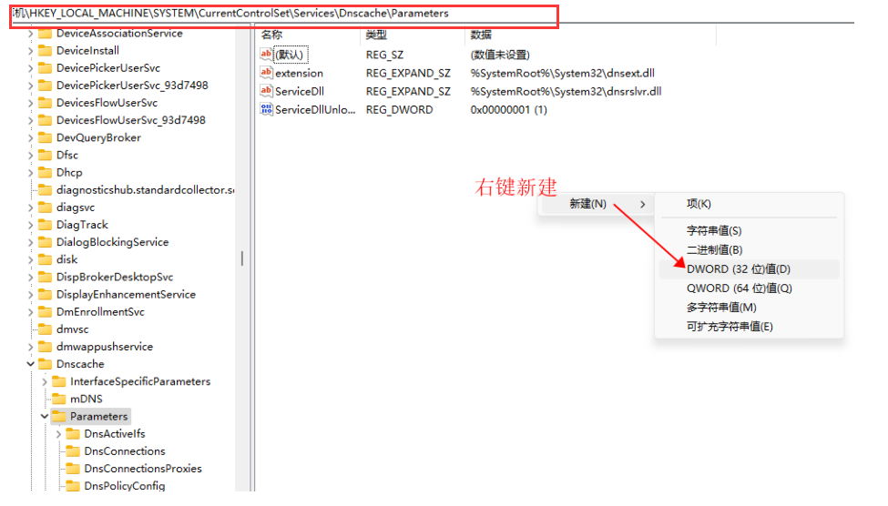 HKEY_LOCAL_MACHINE\SYSTEM\CurrentControlSet\Services\Dnscache\Parameters