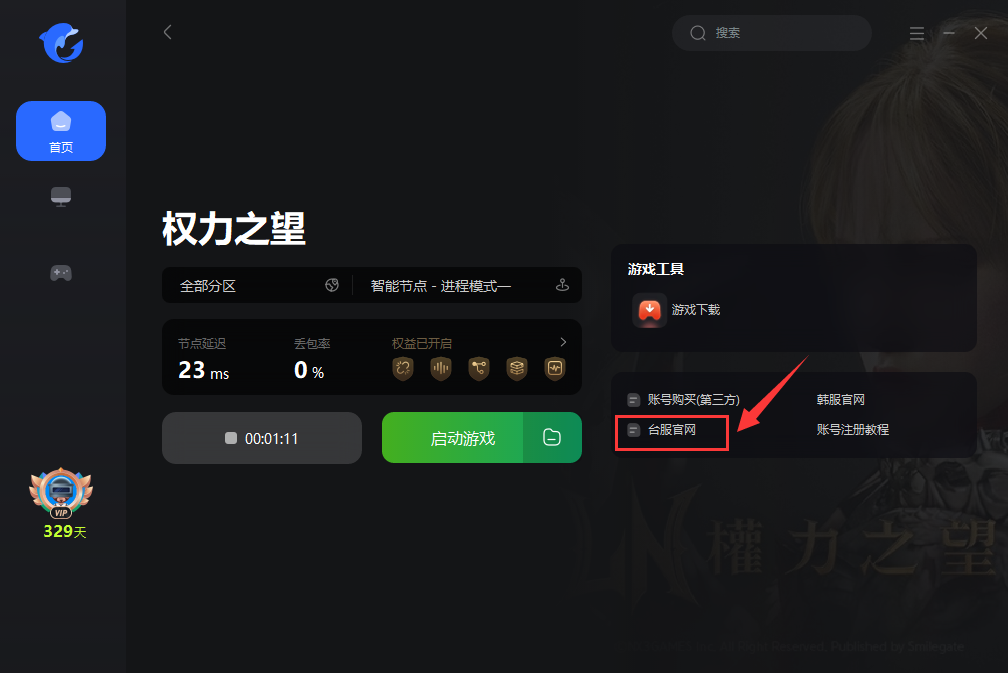 首先打开海豚加速器,搜索权利之望并加速,加速后点击台服官网进入