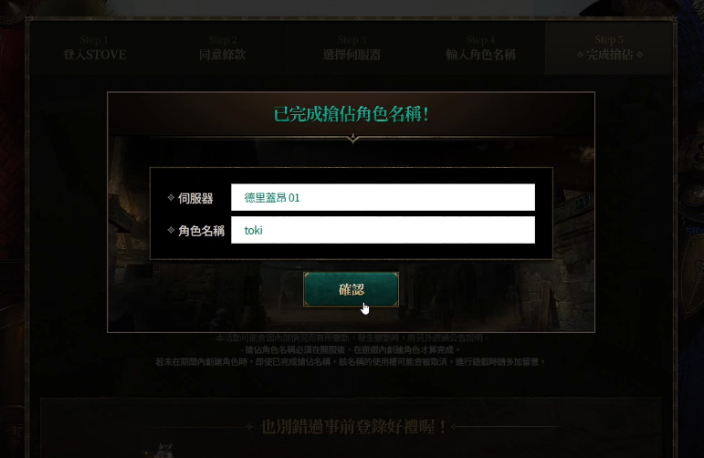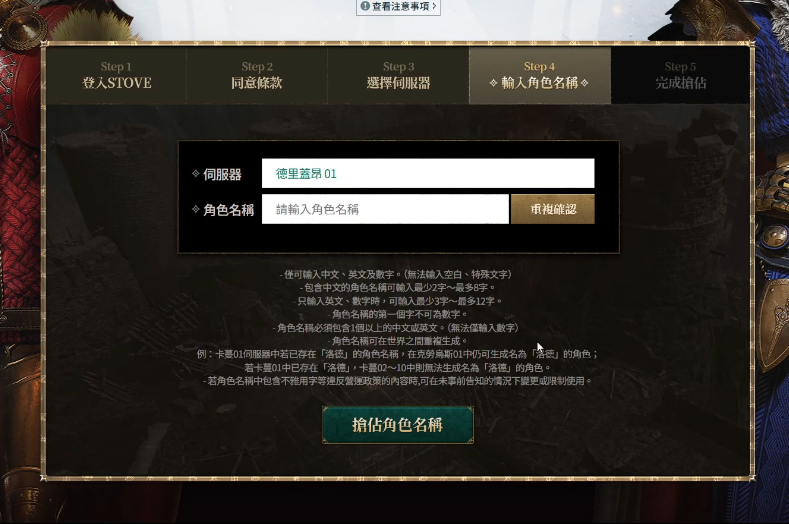 输入名字后点击检测重复,没有重复的话就可以正常进行抢占啦~