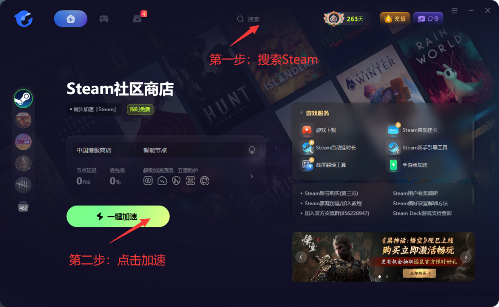 之后要进入steam官网购买、下载游戏,记得打开【海豚加速器】-搜索【steam社区商店】-点击【加速】,就可以为你加速steam,为你解决无法进入steam、下载游戏慢等问题啦