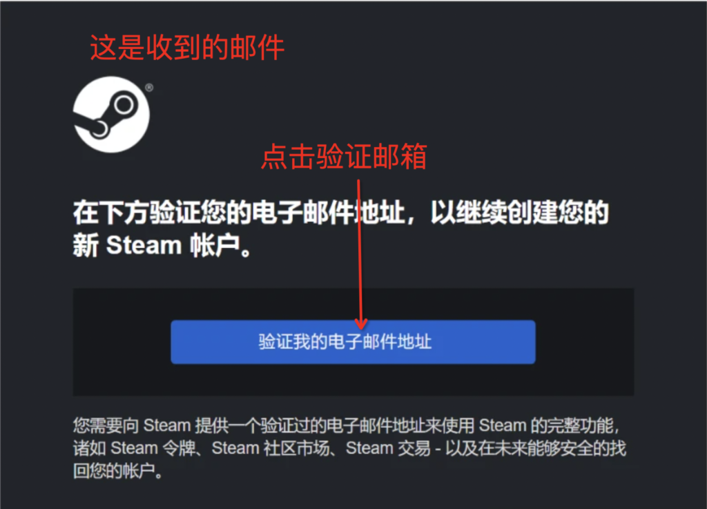 第4步:进入自己的邮箱,点击验证,显示验证成功按照提示返回steam客户端就可以开始创建账户