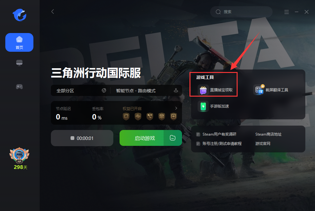 首先打开海豚加速器,搜索三角洲行动国际服并加速,加速后点击右边的直播掉宝领取