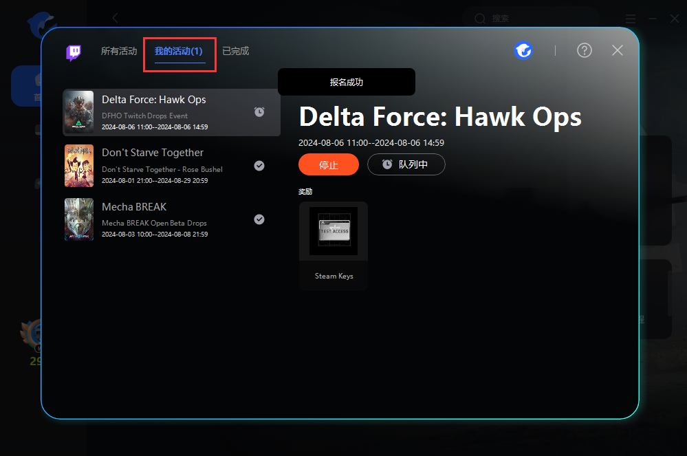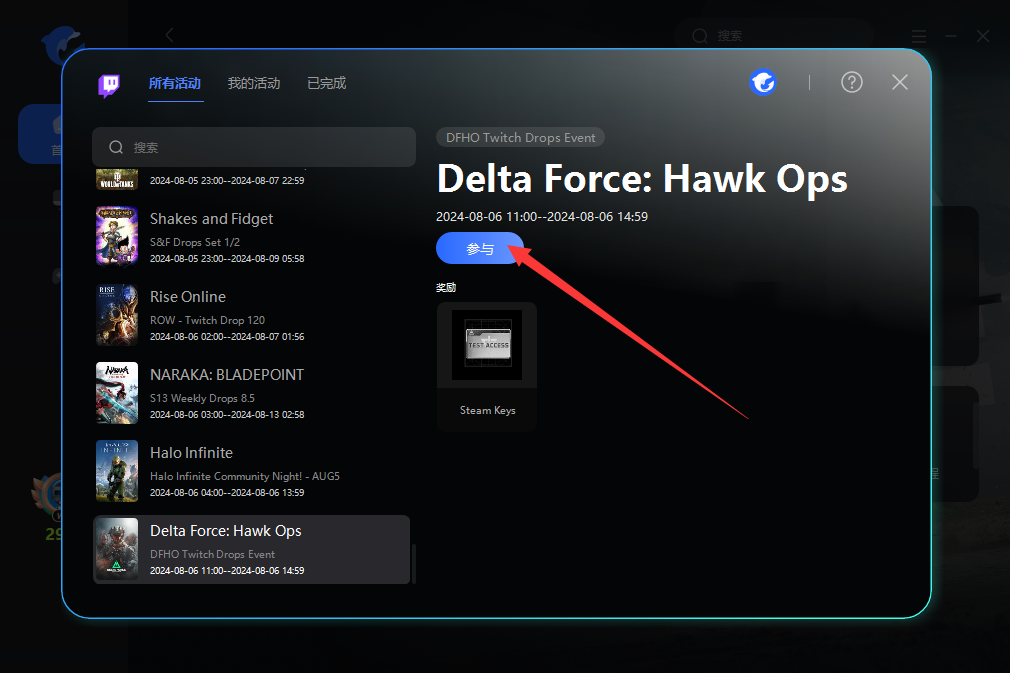 在小工具中找到三角洲行动(Delta Force: Hawk Ops),点击右边的参与