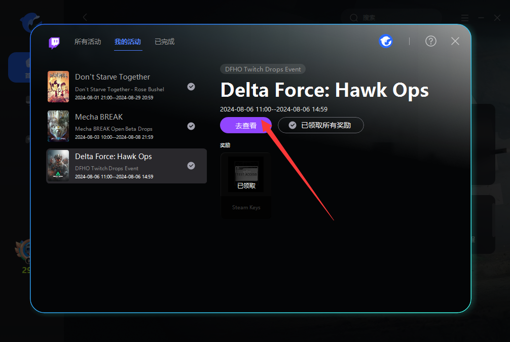 绑定成功后我们再次返回海豚的掉宝小工具,找到三角洲行动,点击参与