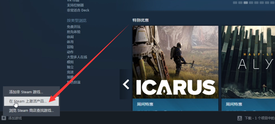 复制刚刚领取的激活码,打开Steam,点击左下角的在Steam上激活产品