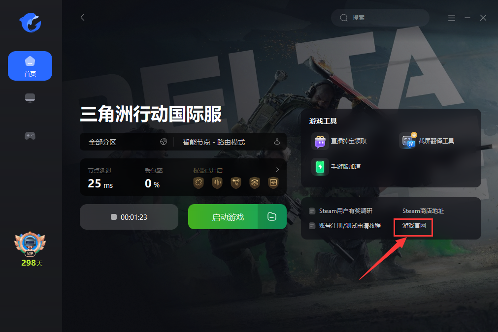 前往官网进行申请,官网直连可能无法打开,打开海豚加速器,搜索三角洲行动国际服进行加速,加速后点击右边的游戏官网进入