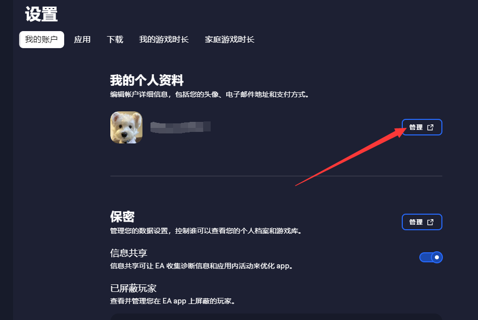 在个人资料中点击管理