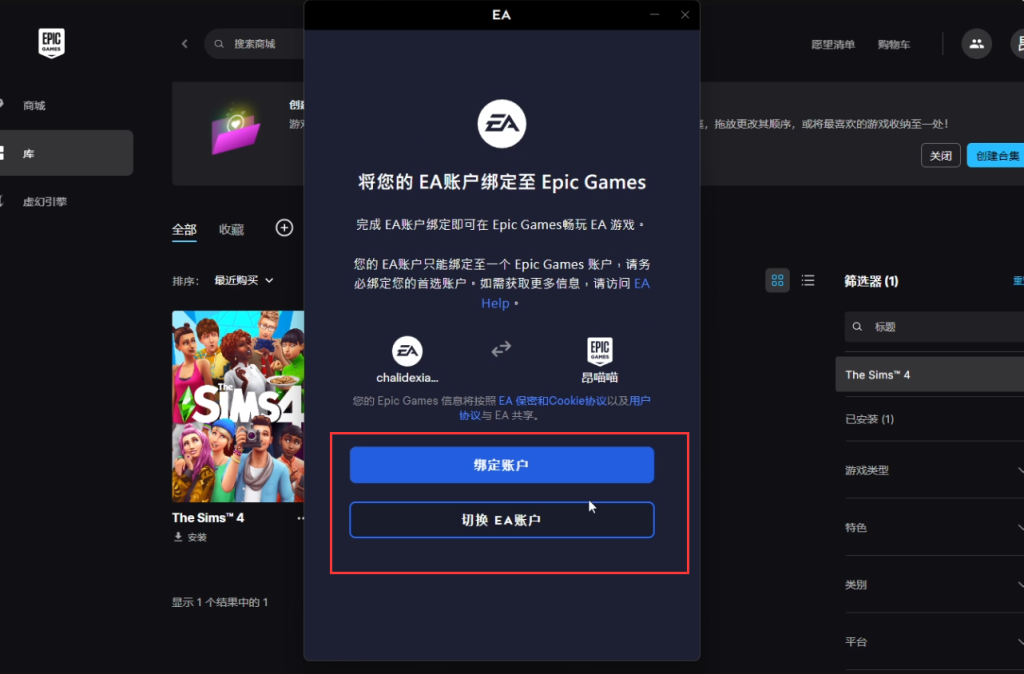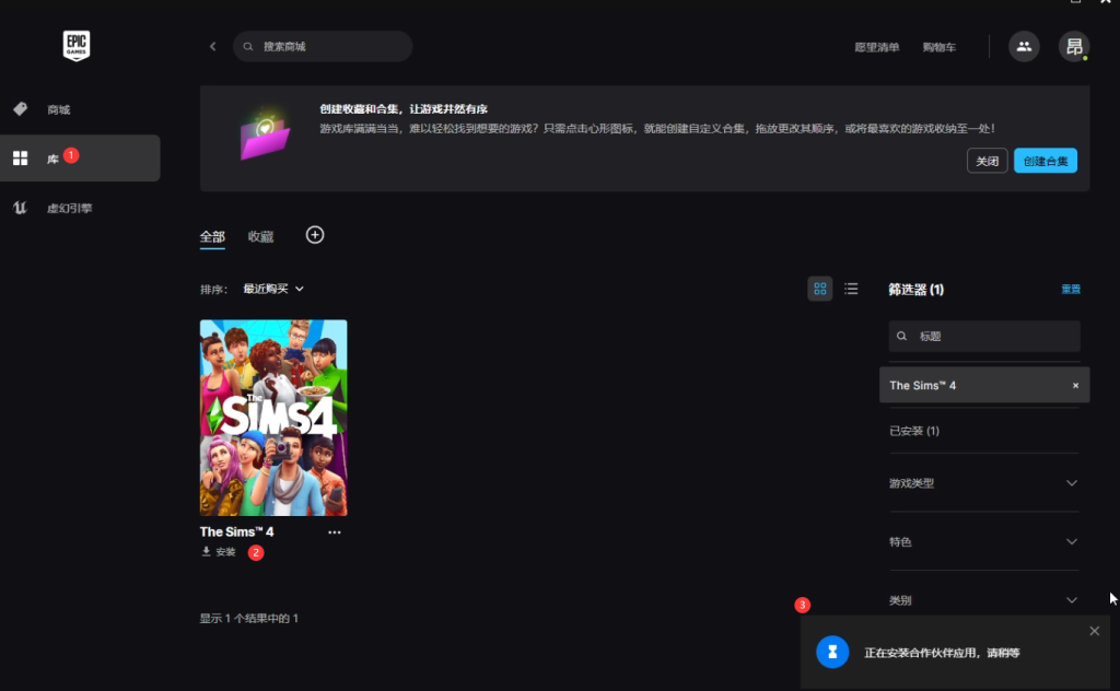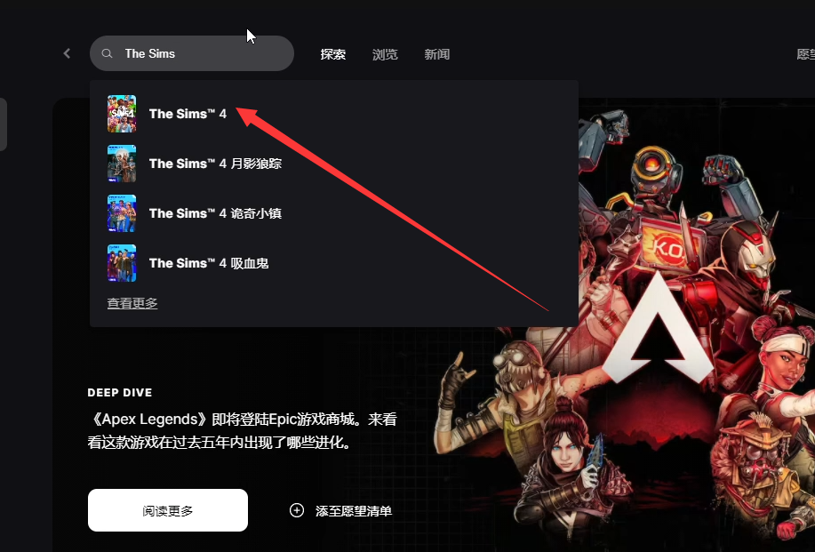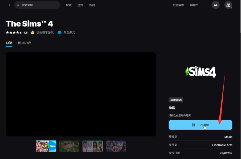 加速后打开Epic,搜索模拟人生4(The Sims)