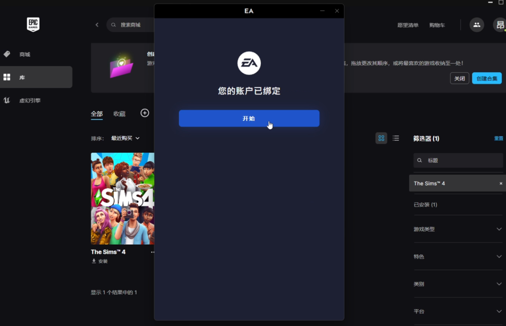 添加成功后,在库中找到游戏,点击下载,这里不会直接下载游戏,右下角会拉起EA进行账号绑定,这里稍等片刻