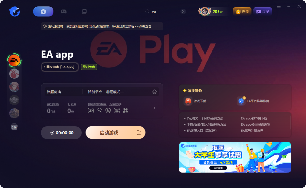 Epic和EA目前暂时无法通过网页进行绑定,目前只能通过在Epic上启动一次EA游戏拉起进行绑定,这里教大家一个简单的解决办法,首先打开海豚加速器,搜索EA并加速,注意全程保持加速,避免报错等问题