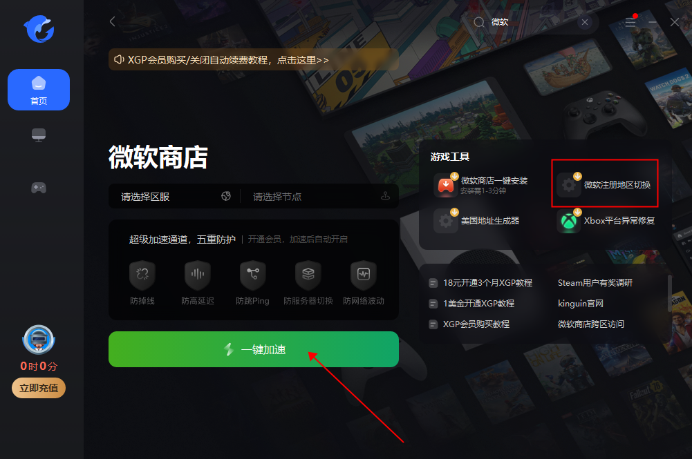 一、打开海豚加速器搜索【微软商店】或【英伟达】开启一键加速并使用注册地区切换将电脑本地地区进行切换,避免后续领取出现异常;