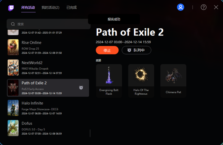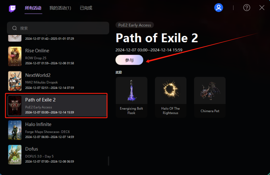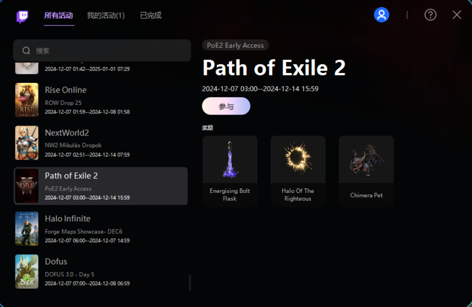 绑定成功后我们再次返回海豚的掉宝小工具,找到流放之路2(Path of Exile2),点击参与