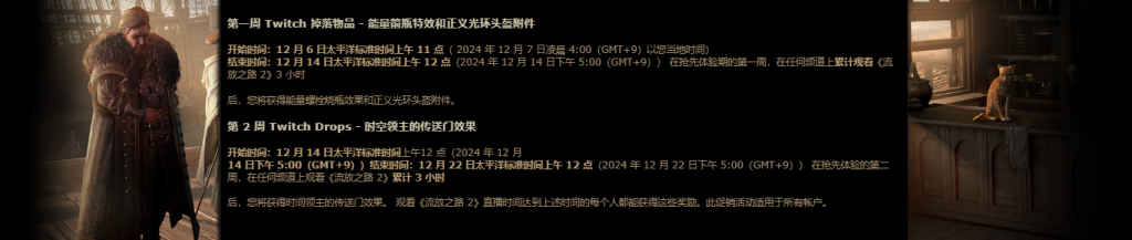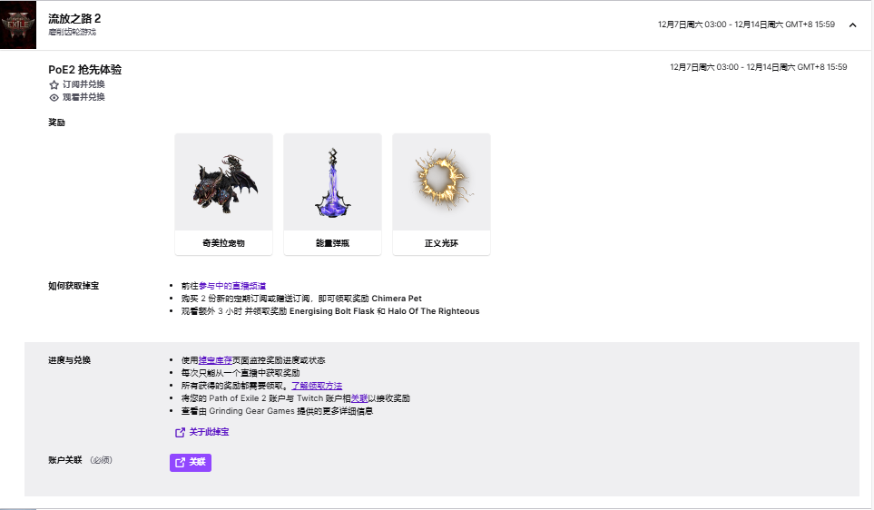 在抢先体验期的第一周,在任何频道上累计观看《流放之路 2 》3 小时后,您将获得能量弹瓶燃烧效果和正义光环头盔附件。