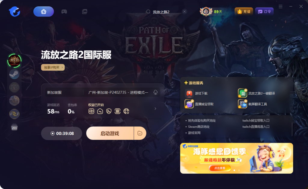 - 使用海豚加速器,搜索并加速【流放之路2国际服】,点击右侧工具栏中的游戏下载,重新下载并覆盖启动器文件。如果仍报错,可以尝试卸载启动器后重新安装。