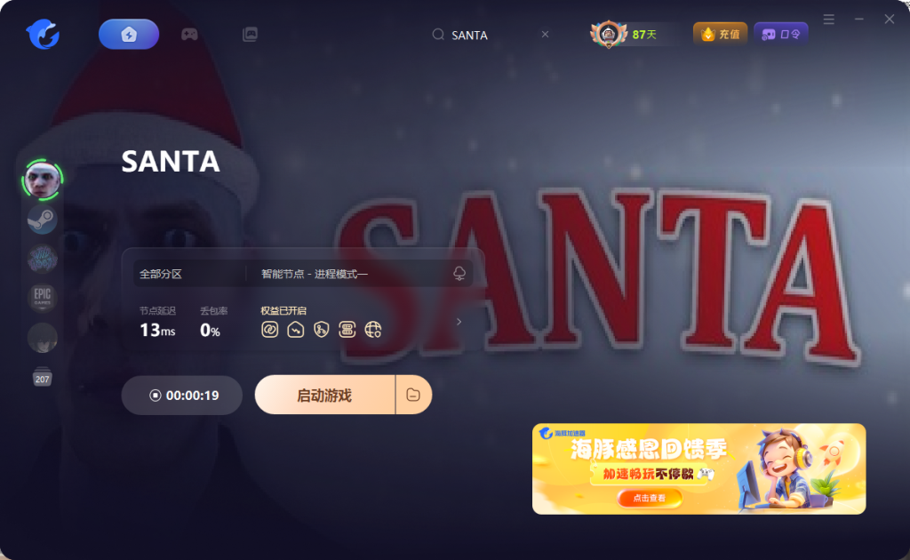 《SANTA》是一款土耳其的多人游戏,但部分玩家可能会因为网络或系统问题遇到节日卡顿、延迟等问题。使用专业工具如海豚加速器可以有效解决这些问题,让你畅快享受游戏的欢乐体验!