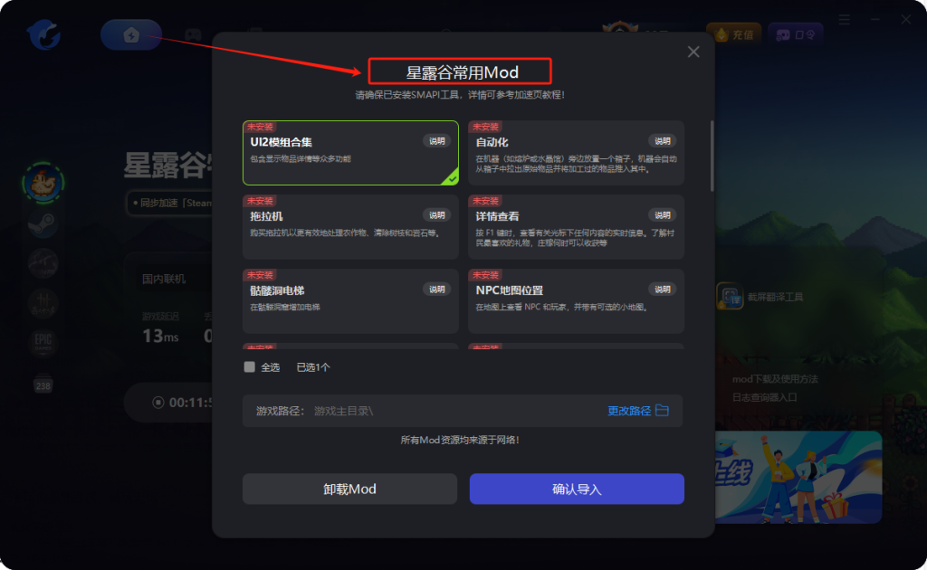 - 确保游戏下载并安装MOD管理工具SMAPI(Stardew Modding API)。没有下载过得朋友仅需点击游戏加速页面,右侧的游戏下载!即可一键下载mod前置文件!