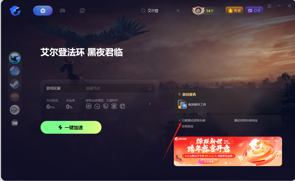 1. 打开加速器搜索并加速《艾尔登法环 黑夜君临》,点击右侧测试申请地址(建议选择日服);