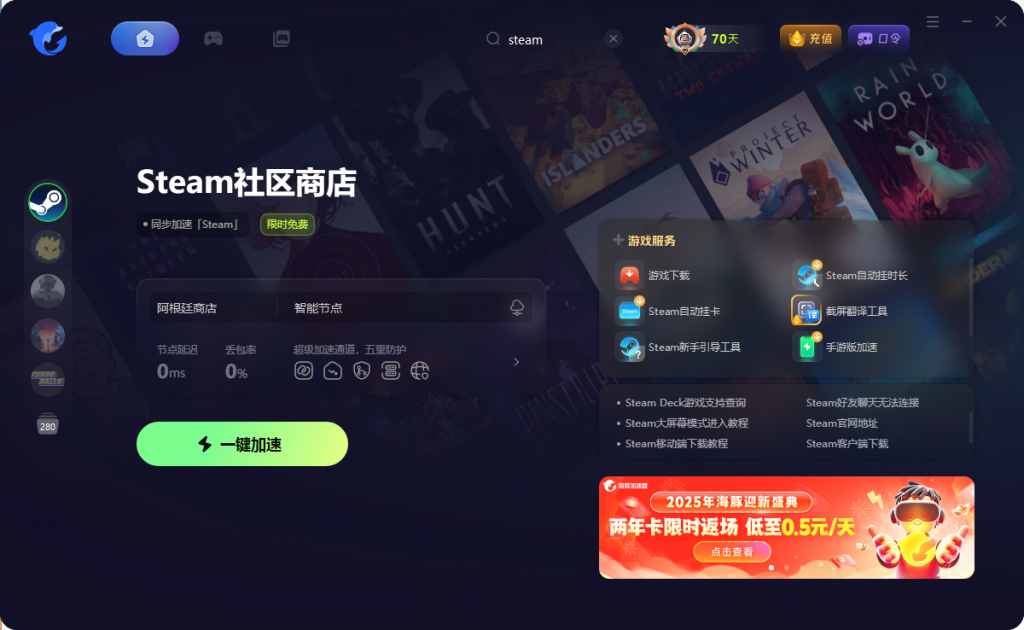下面我将全程用阿区账号做教程,大家需要根据自己的需求进行创建,首先打开海豚加速器,搜索Steam社区商店,选择阿区进行加速,加速后点击Steam官网进入。