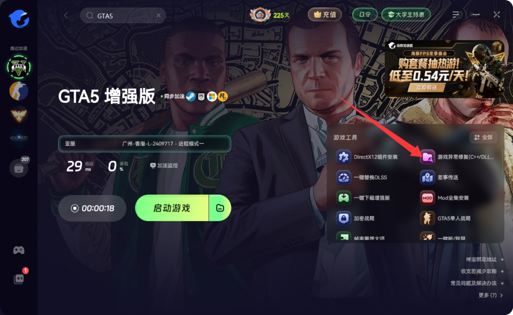 网上的修复工具错综复杂,可以使用可靠的修复工具海豚加速器,操作方法也比较简单,在海豚加速器中搜索GTA5并加速,加速后点击右边的【游戏异常修复】