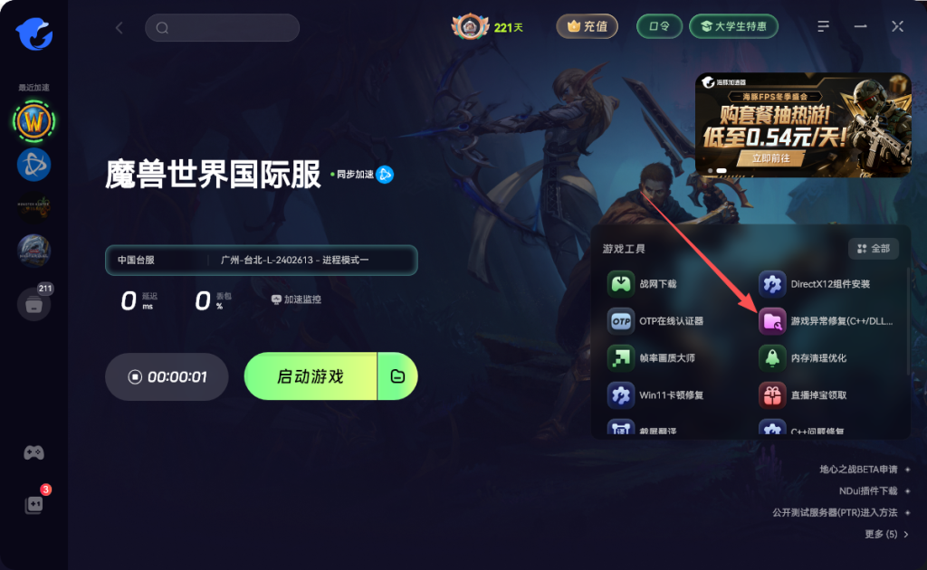 2、使用DLL修复工具, 我们需要先下载一个可靠的修复工具海豚加速器,操作方法也比较简单,在海豚加速器中搜索魔兽世界国际服并加速,加速后点击右边的【游戏异常修复】