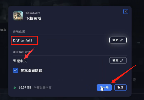 重点:然后安装位置重新选择下载到之前下好泰坦陨落2的那个目录,并在下方选择繁体中文
