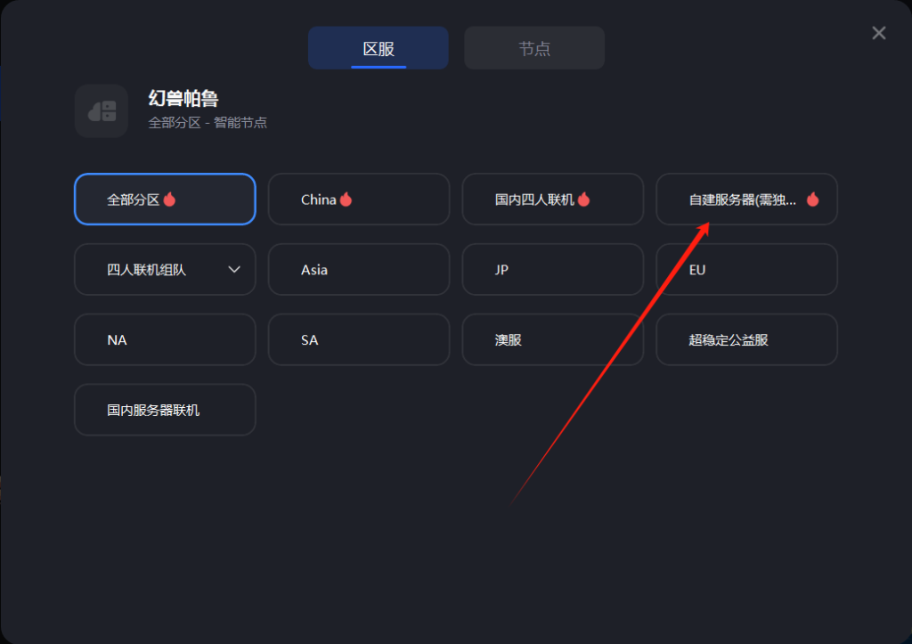 3. 区服选择【自建服务器】开启一键加速,使用一键搭建本地服务器工具,选择【已购买,直接启动】