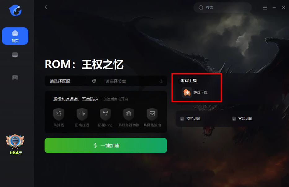 1、打开海豚加速器,搜索王权之忆,点击游戏工具【游戏下载】。
