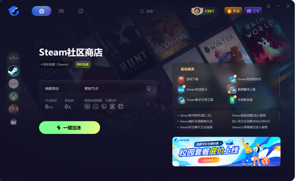 1. 打开海豚加速器搜索【Steam社区商店】并开启一键加速;