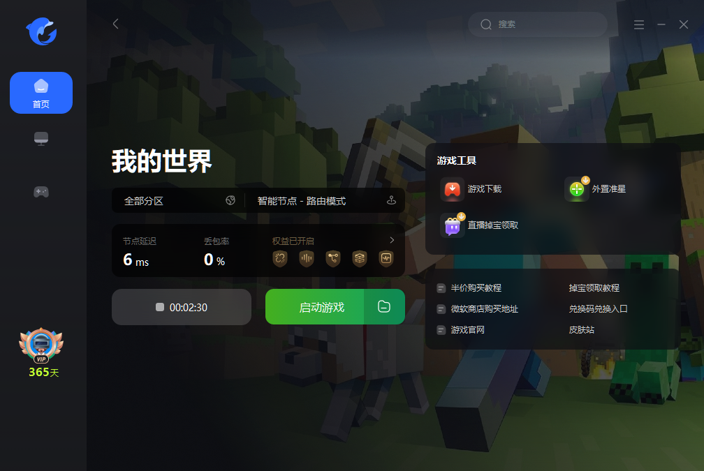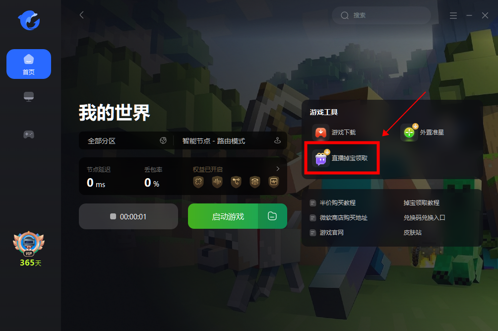 1.打开海豚加速器搜索【我的世界】选择美服并开启一键加速,点击右侧【直播掉宝领取】工具;